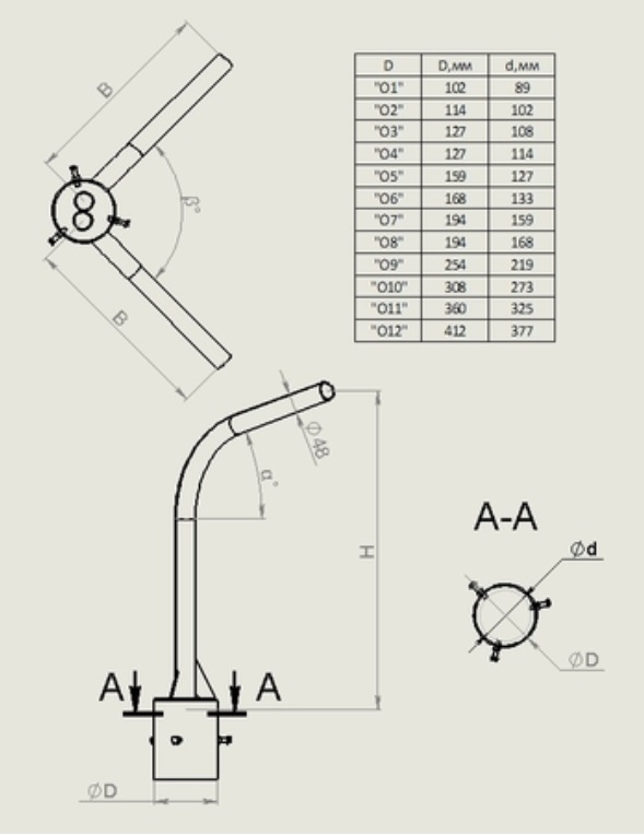 Кронштейн радиусный двухрожковый на обечайке предназначен для размещения двух консольных светильников на трубчатых опорах освещения: силовых ОС и не силовых типа ОТ(159/133).