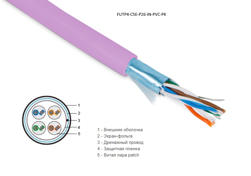 | 408981 | 444671 | FUTP4-C5E-P26-IN-PVC-PK-305 | Hyperline FUTP4-C5E-P26-IN-PVC-PK-305 Кабель витая пара, экранированная F/UTP, категории 5e, 4 пары (26 AWG), многожильный (patch), экран - фольга, PVC, –20°C – +75°C, розовый | розовый | упак 305м | Заказать |