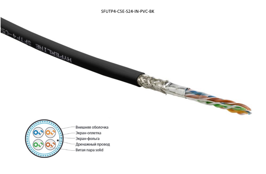 | 409011 | 444634 | SFUTP4-C5E-S24-IN-PVC-BK-305 | Hyperline SFUTP4-C5E-S24-IN-PVC-BK-305 Кабель витая пара SF/UTP, категория 5e, 4 пары(24 AWG), одножильный(solid), экран - фольга + медная оплетка, PVC, –20°C – +75°C, черный - гарантия:15 лет компонентная; 25 лет системная | черный | Заказать |