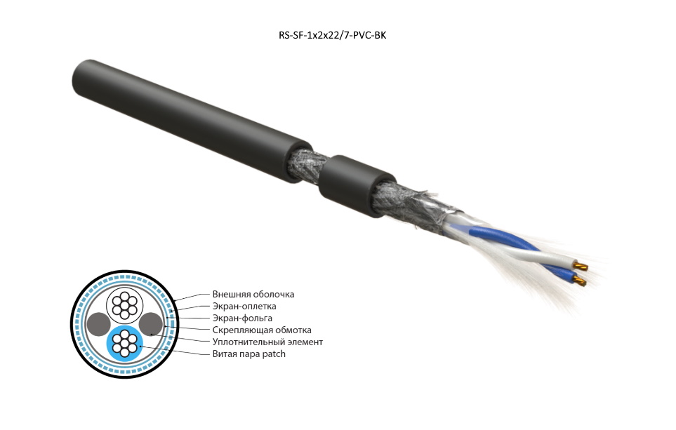 Кабель интерфейса RS-485, экранированный SF/UTP, 2 пары 24 AWG, 2х2х0,61 мм, многопроволочные жилы (patch) 7х0.20 мм, PVC, -40°C - +80°C, черный