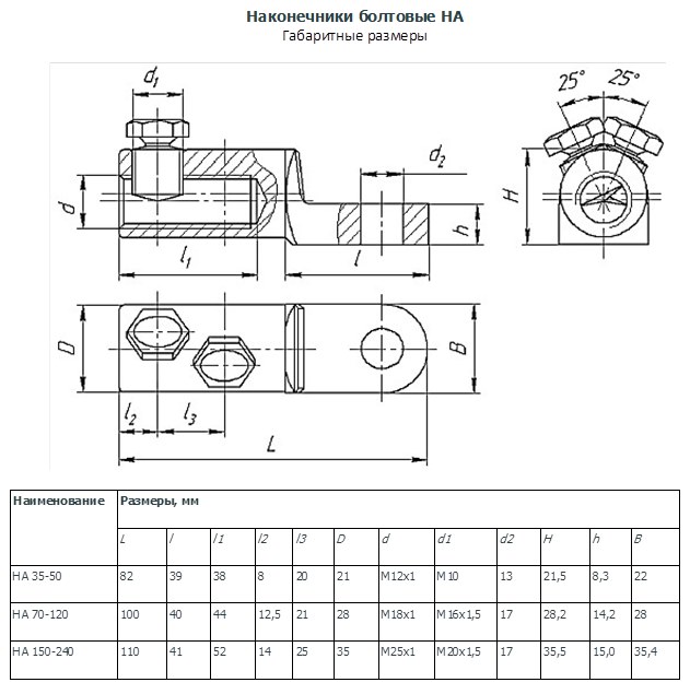 Наконечники болтовые НА предназначены для оконцевания затяжкой болтами предварительно зачищенных от изоляции алюминиевых и медных жил проводов и присоединения к алюминиевым или медным клеммам, шинам, зажимам и т.п. Наконечники изготавливаются из дюралюминиевых сплавов марки В95 и Д16Т1. Вид климатического исполнения наконечников – УХЛ3 ГОСТ 15150-69.