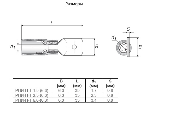 - Размер контакта определяется шириной «В» клеммы РПИ-П-Т