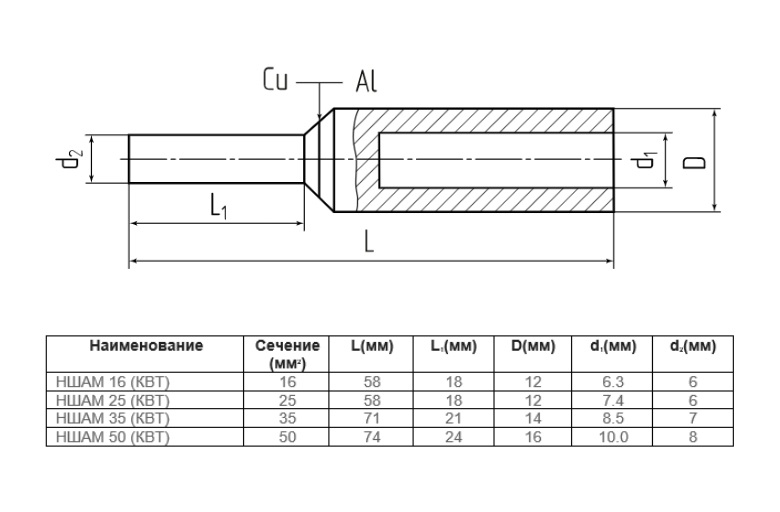 | 399032 | 81985 | НШАМ 16 | Наконечник штыревой алюмо-медный, сечение 16мм.кв.; длина 58мм | Заказать |