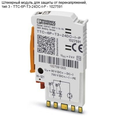 | 355517 | 1027584 | Устройство защиты от перенапряжений, тип 3 - TTC-6P-T3-24DC-UT-I | УЗИП типа 3, в комплектации из защитного штекера и базового элемента, со встроенным индикатором состояния для источников питания 24 В DC. | Заказать |