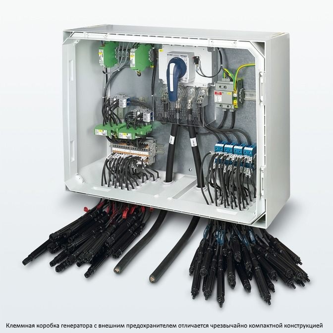 | 356322 | 1053599 | Соединительные коробки генераторов - SOL-SC1-18ST-0-F-21 | Распределительный щит генератора для фотогальванических установок до 1000 В DC для подключения до 18 цепей. С двухсторонней защитой предохранителями, установленными в держателе. Ввод кабеля через многосекционный кабельный ввод. Включая вставки предохранителя 15 A. | Заказать |
