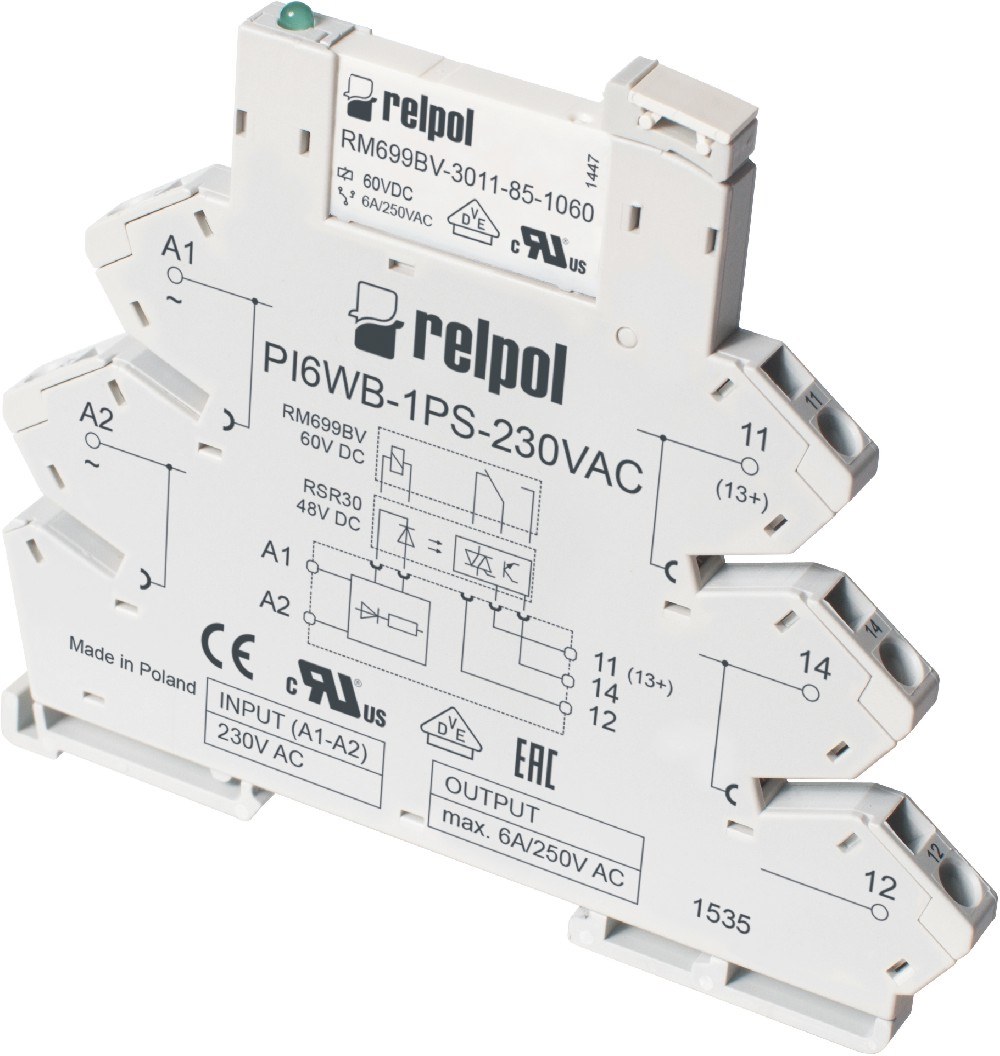 | 349189 | 858656 | PIR6WB-1PS-230VAC/DC-R01 (СЕРЫЙ) (CE) | Узкопрофильное интерфейсное реле: 1P - один переключающий контакт, AgSnO2 / Au - жесткое золочение. Ширина 6,2 мм. Пружинные зажимы. Выход (съемный - реле RM699BV, код «R01»): контакты 1P - клеммы: 11-12-14; AC1 - 50 мА / 30 В; DC1 - 50 мА / 36 В. Входные клеммы: A1 - A2 - любая полярность, напряжение питания Un - 230 В AC / DC. Размеры: 98,3 x 6,2 x 84,6 мм. Монтаж на 35-мм рельс. IP 20 | 230 V AC/DC | Заказать |