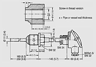 Ввинчивающийся термометр сопротивления высокого давления с соединительной головкой и консолью, размеры в мм (дюймах)