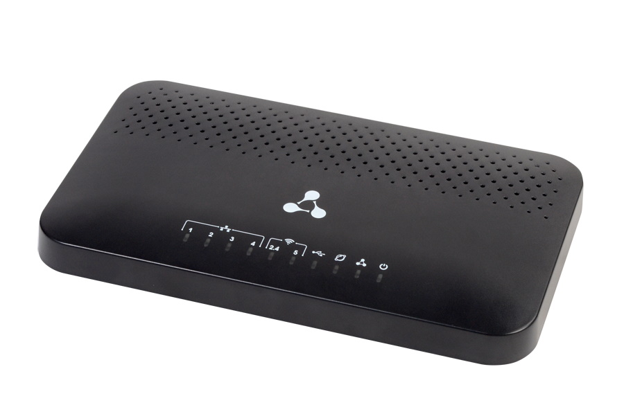 Универсальный абонентский маршрутизатор GPON: 1 порт GPON и 4 порта Ethernet 10/100/1000 Base-T(RJ-45), 1 порт FXS, 1 порт USB, два приемо-передатчика Wi-Fi IEEE 802.11b/g/n и RF-разъем (CaTV).